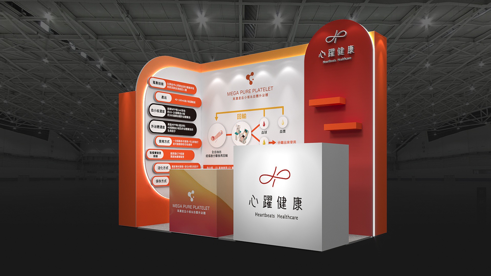 醫學會展覽設計_心躍健康MEGA PURE PLATELET高濃度血小板技術展示牆,紅橘色調品牌空間全景