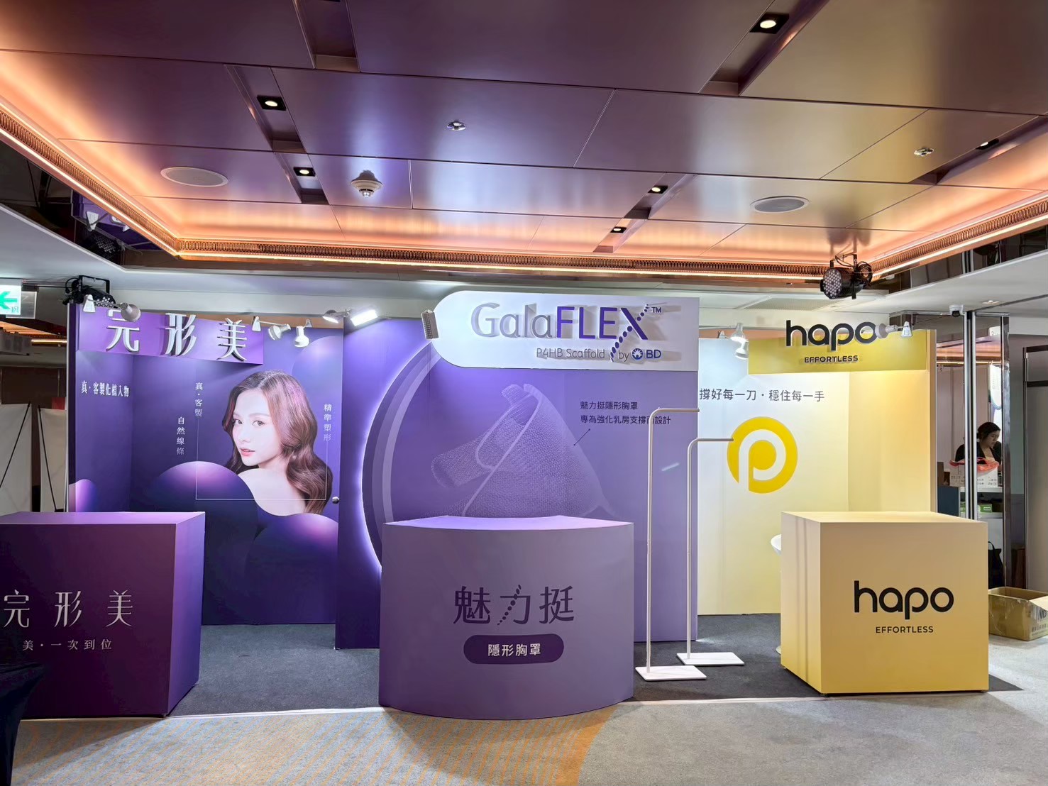 為蓓蕾莉於美容外科醫學會打造結合品牌美學與產品專業的展覽攤位。以優雅紫色調為主軸,整合GalaFLEX魅力挺隱形胸罩、完形美與hapo等品牌產品線,建構出兼具時尚感與醫學專業度的品牌展示空間。